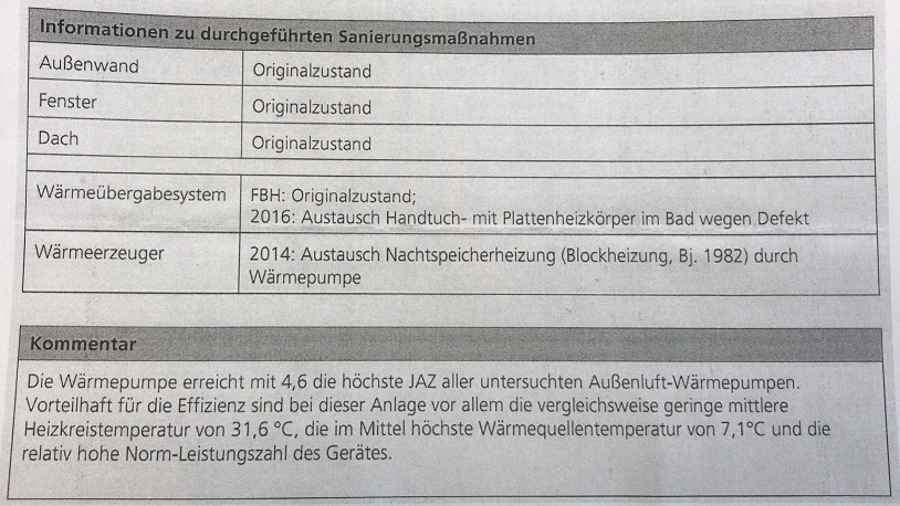 Wir haben mit zwei Anlagen beim Fraunhofer Wärmepumpen Feldtest WPsmart im Bestand (2014-2019) teilgenommen. Unsere Anlage in einem nicht sanierten Gebäude mit einer Heliotherm-Wärmepumpe, einer Fußbodenheizung und unserem Frischwassersystem wurde als die Anlage mit der höchsten Jahresarbeitszahl vermessen. Unsere zweite Anlage mit neuen Heizkörpen hat nach unserem Kenntnisstand Platz drei erreicht.